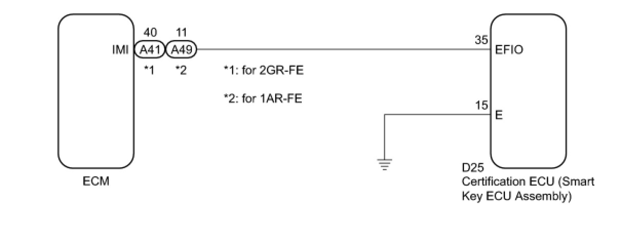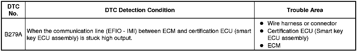 If the communication line (EFIO - IMI) to the certification ECU (smart key ECU assembly) is stuck high output (e.g. shorted to +B), the ECM stores this DTC.