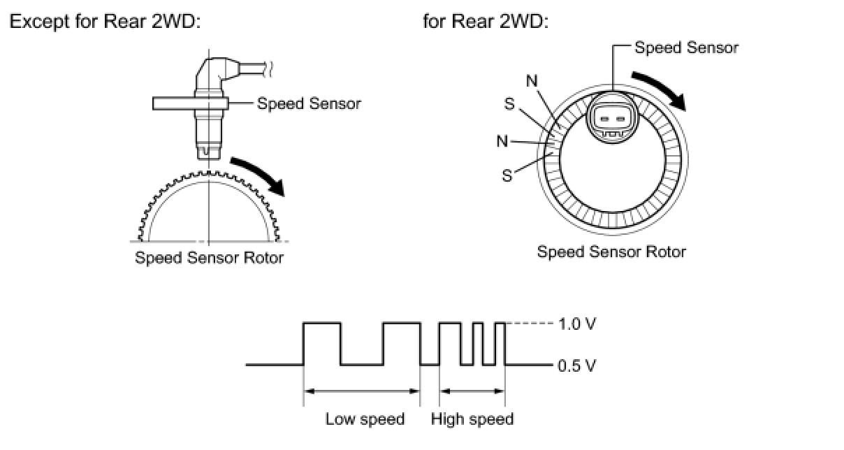 The skid control ECU measures the speed of each wheel by receiving signals from the speed sensor.