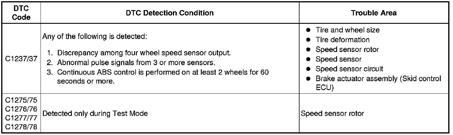 DTCs C1275/75 to C1278/78 will be cleared when the speed sensor sends a vehicle speed signal or when Test Mode ends. DTCs C1275/75 to C1278/78 are output only in Test Mode.