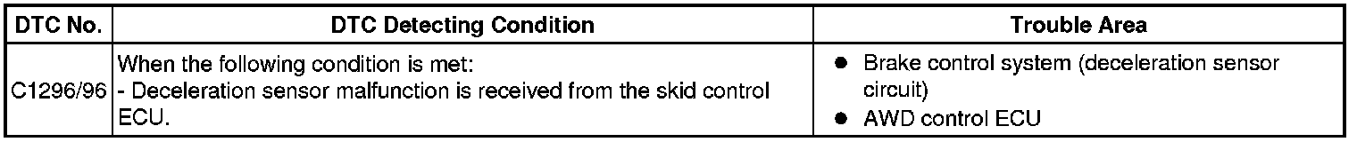 If a malfunction in the deceleration sensor circuit occurs, the AWD control ECU will output this DTC.