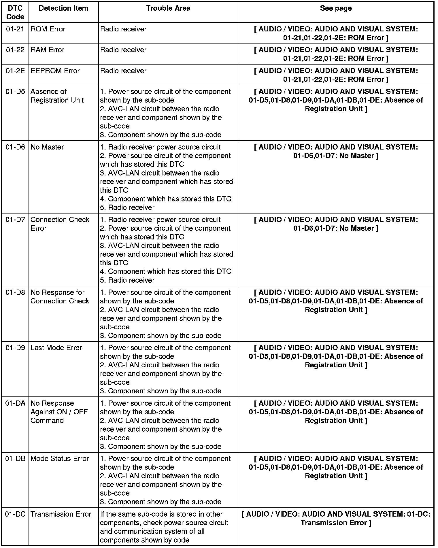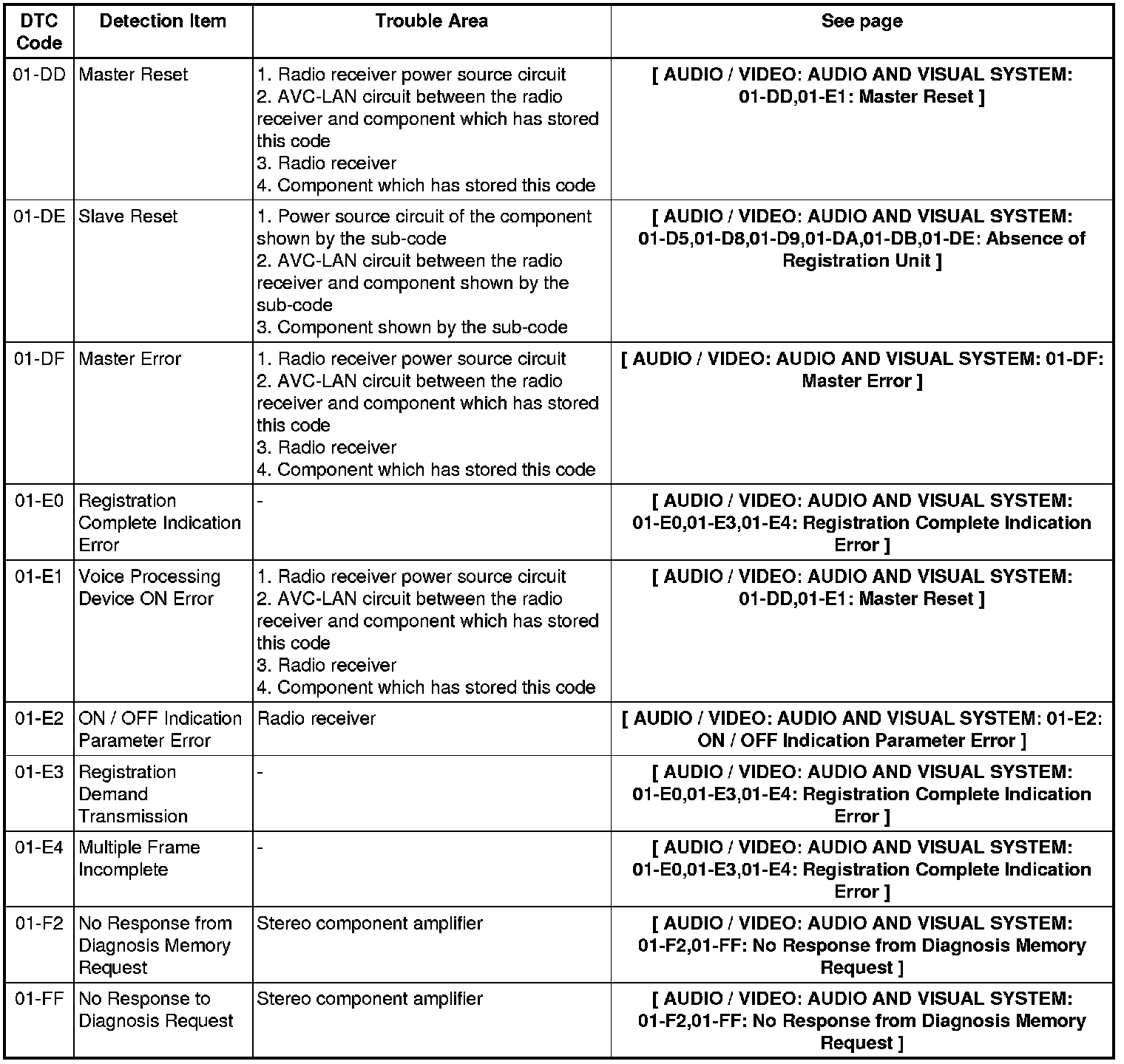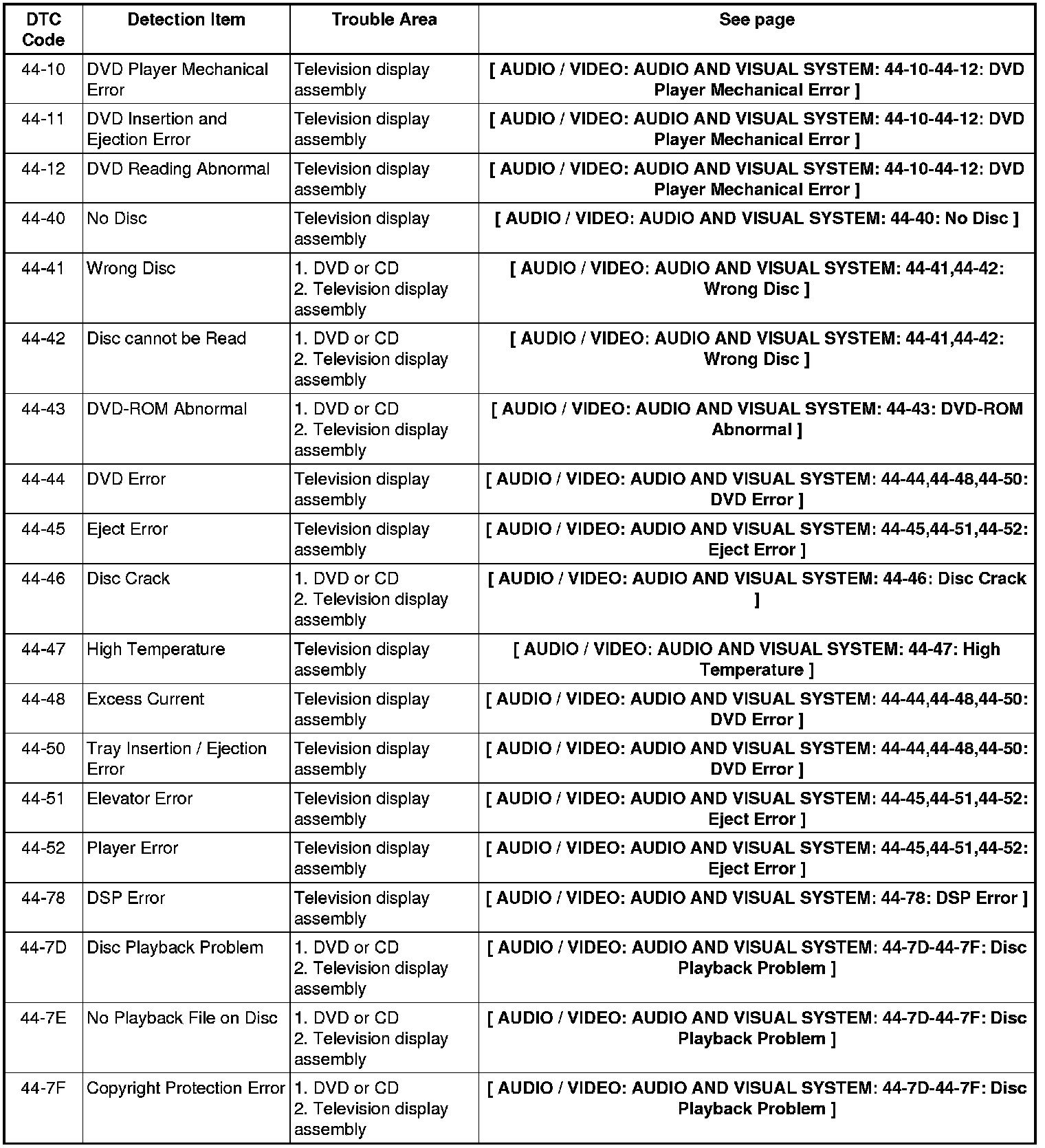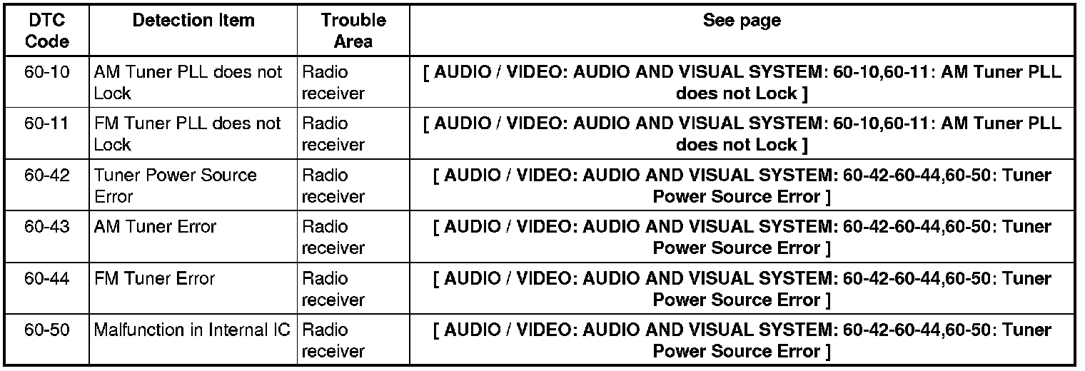 AUDIO / VIDEO: AUDIO AND VISUAL SYSTEM: DIAGNOSTIC TROUBLE CODE CHART