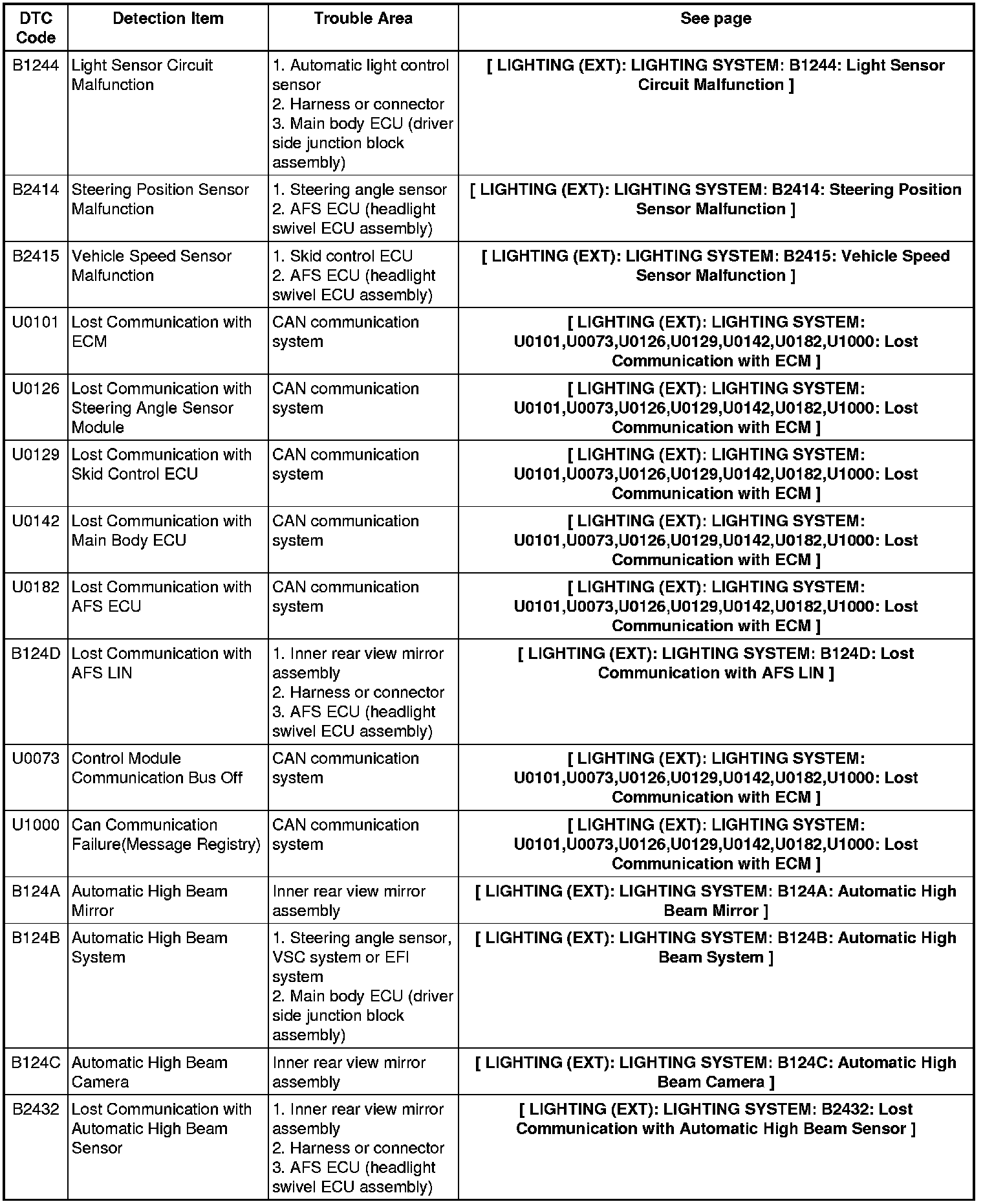 LIGHTING (EXT): LIGHTING SYSTEM: DIAGNOSTIC TROUBLE CODE CHART