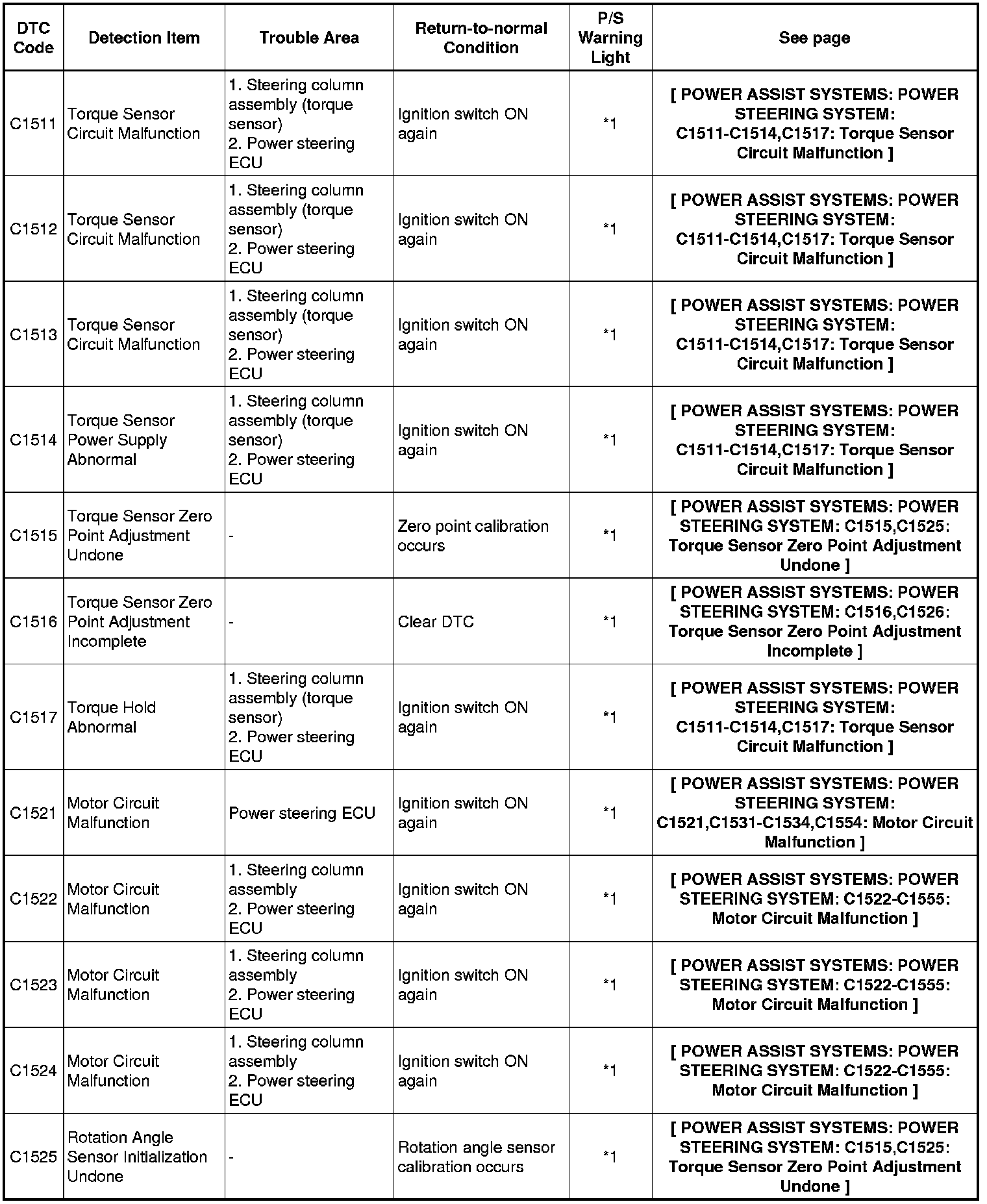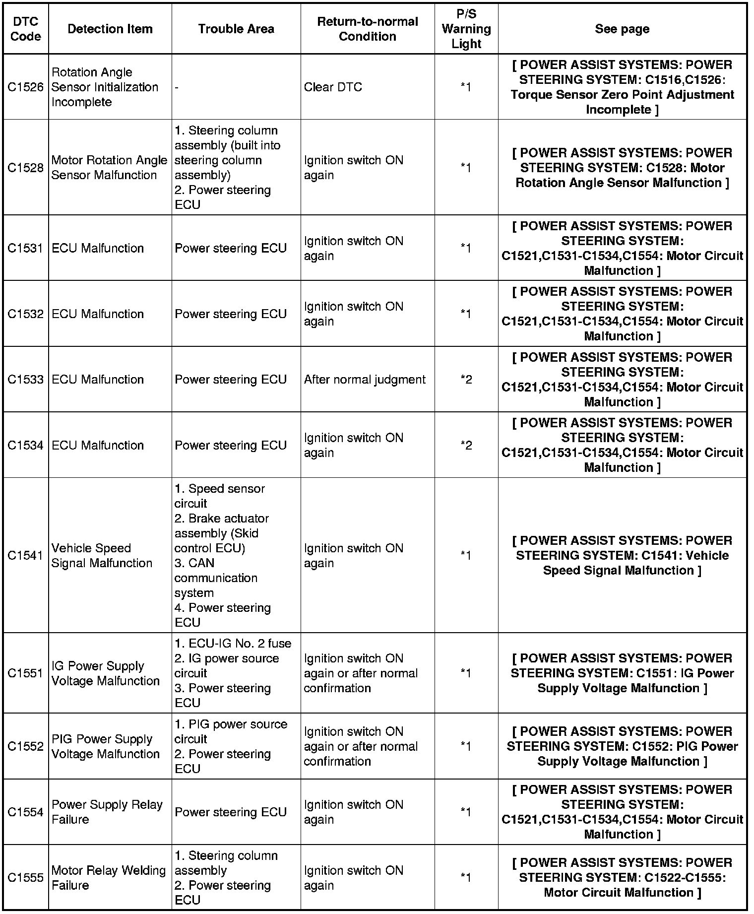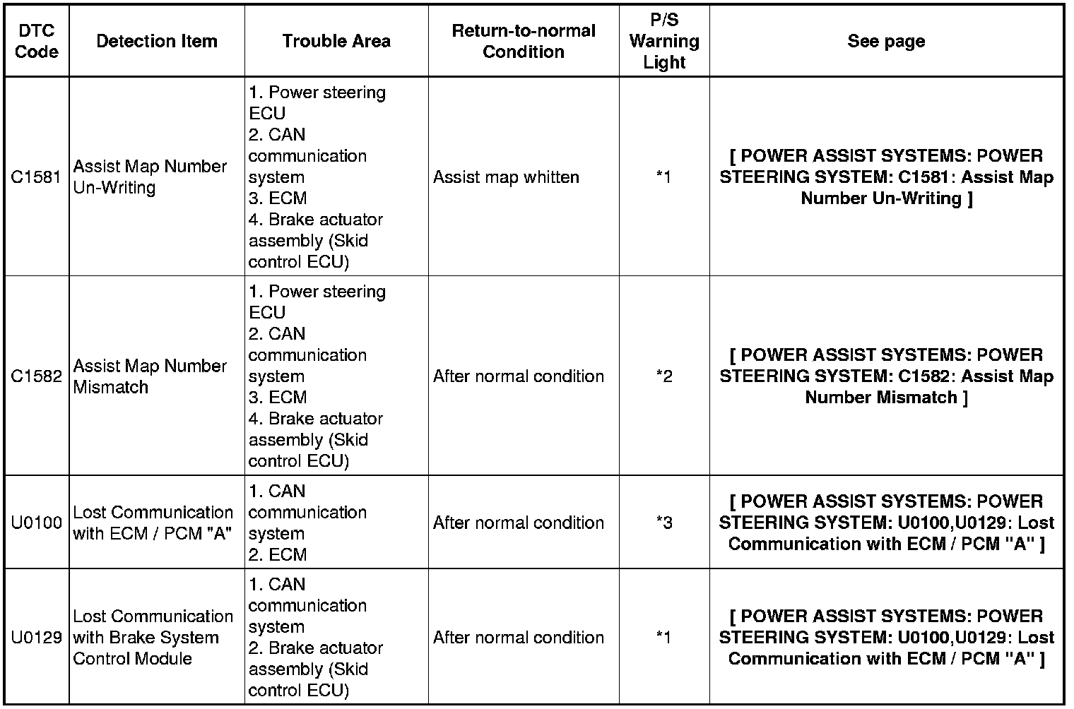 POWER ASSIST SYSTEMS: POWER STEERING SYSTEM: DIAGNOSTIC TROUBLE CODE CHART
