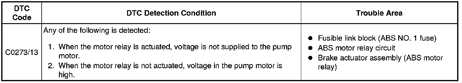 BRAKE CONTROL / DYNAMIC CONTROL SYSTEMS: VEHICLE STABILITY CONTROL SYSTEM: C0273/13: Open or Short Circuit in ABS Motor Relay Circuit