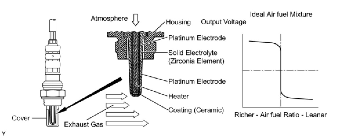 When the air fuel ratio becomes lean, the oxygen concentration in the exhaust gas is great. The heated oxygen sensor informs the ECM that the post-three way catalytic converter air fuel ratio is lean (low voltage, i.e. less than 0.45 V).