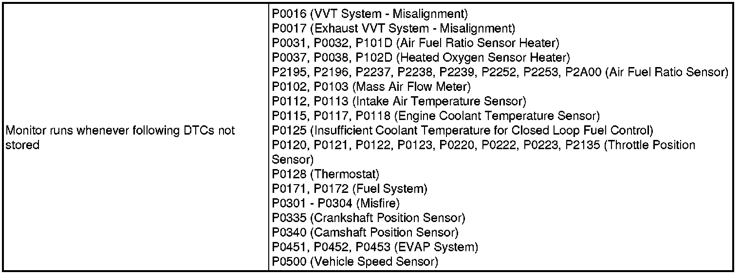 While performing active air fuel ratio control, when the target air fuel ratio is rich and the heated oxygen sensor voltage output is 0.21 V or less (lean), the ECM interprets this as an abnormally low sensor output voltage and stores DTC P0137. When the target air fuel ratio is lean and the voltage output is 0.69 V or higher (rich) during active air fuel ratio control, the ECM determines that the sensor voltage output is abnormally high, and stores DTC P0138.
