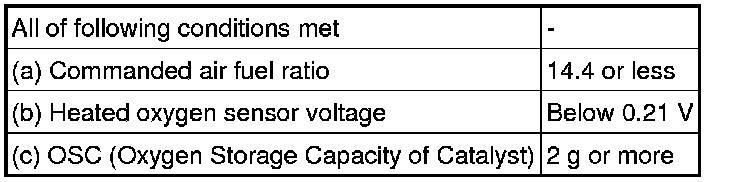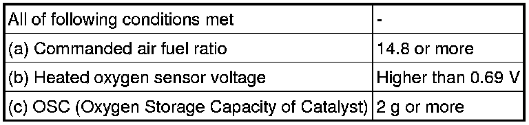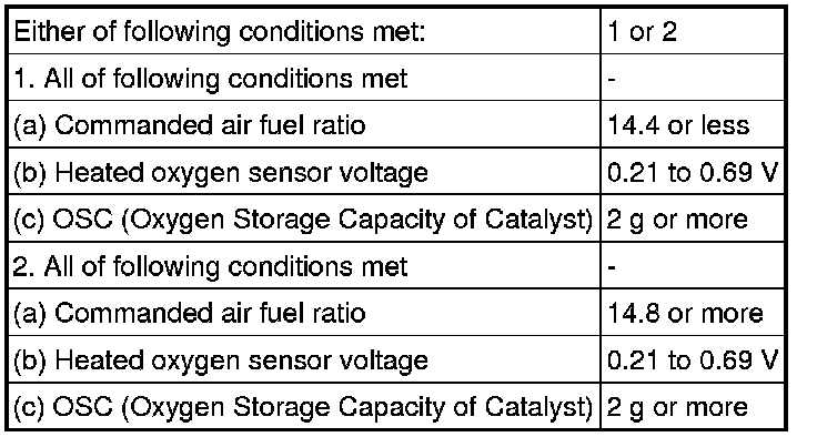 If the heated oxygen sensor has an open or short, or the voltage output of the sensor noticeably decreases, the oxygen storage capacity indicates an extraordinarily high value. Even if the ECM attempts to continue regulating the air fuel ratio to become rich or lean, the heated oxygen sensor output does not change.