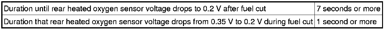 The sensor output voltage drops to below 0.2 V (extremely lean status) immediately when the vehicle decelerates and fuel cut is operating. If the voltage does not drop to below 0.2 V for 7 seconds or more, or voltage does not drop from 0.35 V to 0.2 V for 1 second, the ECM determines that the sensor response has deteriorated, illuminates the MIL and stores a DTC.