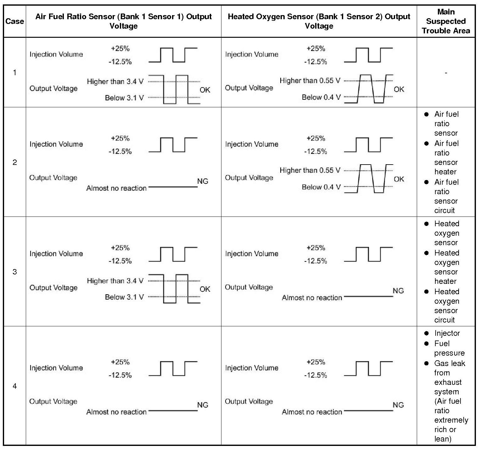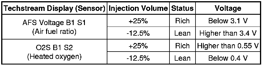 * Following the Control the Injection Volume for A/F Sensor procedure enables technicians to check and graph the voltage outputs of both the air fuel ratio and heated oxygen sensors.