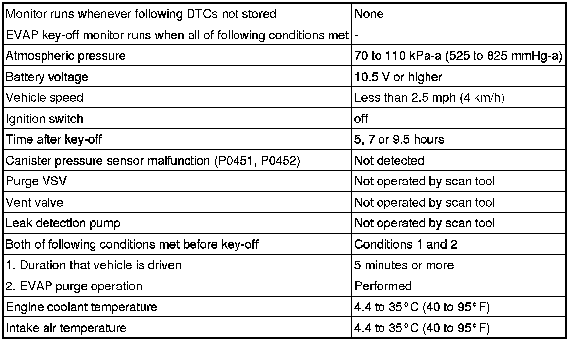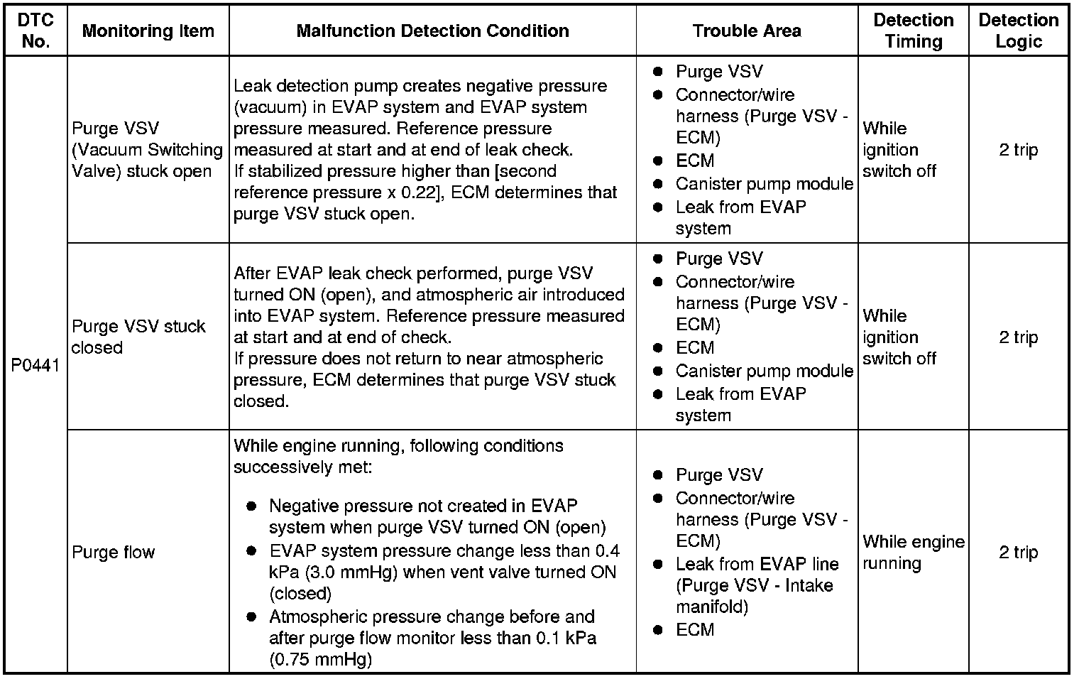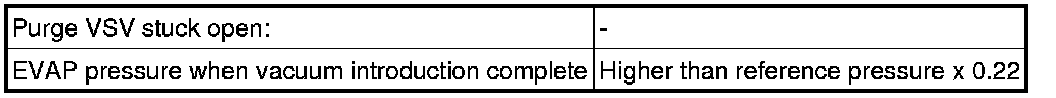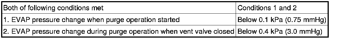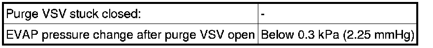 The vent valve is turned ON (closed) and the EVAP pressure is then measured. If the variation in the pressure is less than 0.4 kPa (3.0 mmHg), the ECM interprets this as the purge VSV being stuck closed, illuminates the MIL and stores DTC P0441 (2 trip detection logic).