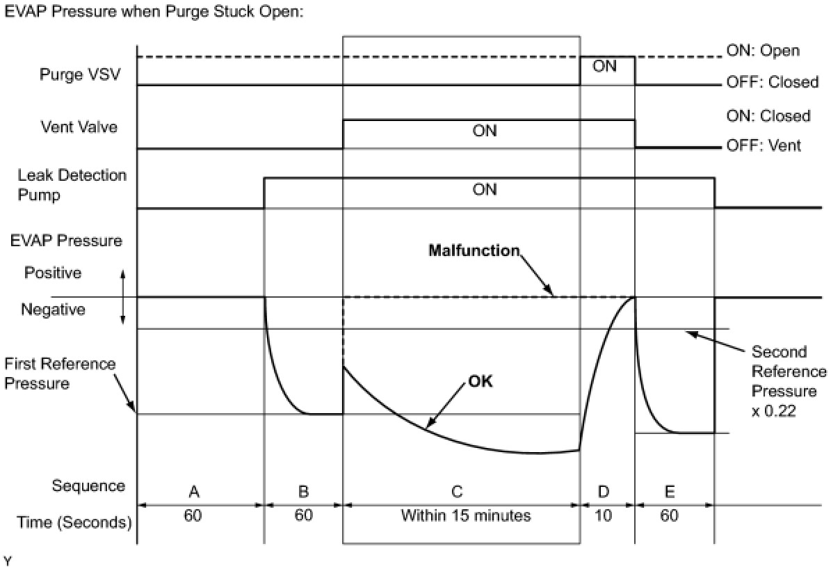 In operation C, the leak detection pump creates negative pressure (vacuum) in the EVAP system. The EVAP system pressure is then measured by the ECM using the canister pressure sensor. If the stabilized system pressure is higher than [second reference pressure x 0.22], the ECM interprets this as the purge VSV (Vacuum Switching Valve) being stuck open. The ECM illuminates the MIL and stores the DTC (2 trip detection logic).