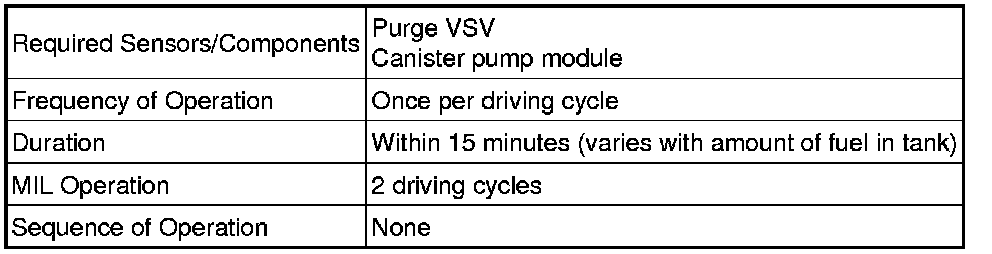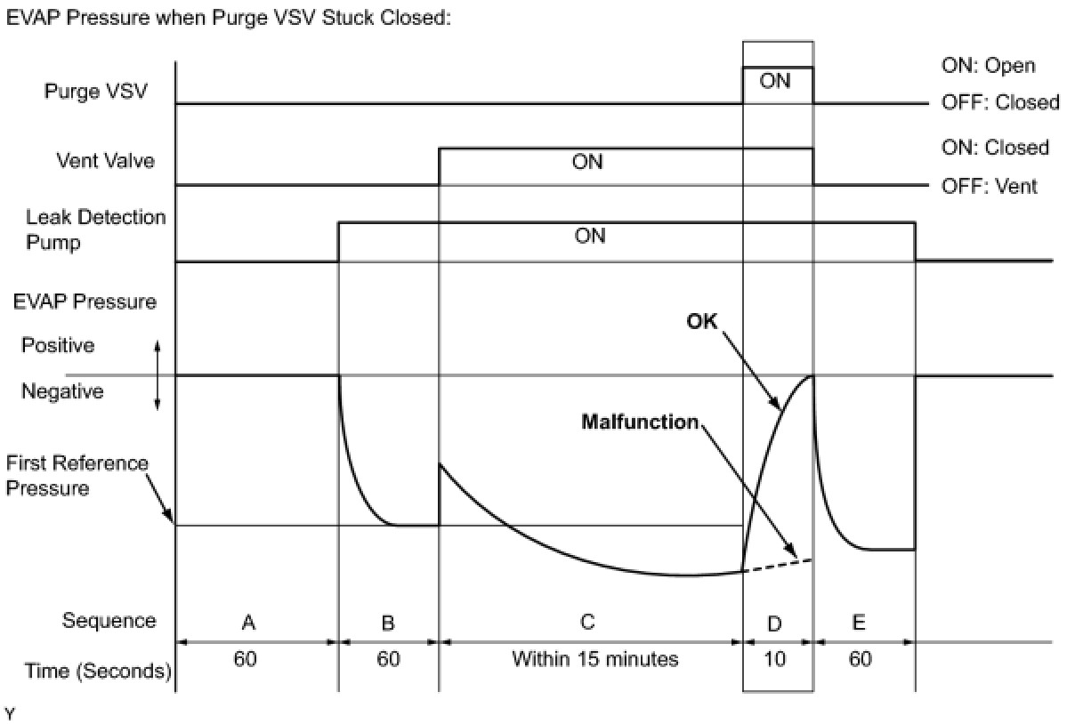 In operation D, the canister pressure sensor measures the EVAP system pressure. The pressure measurement for the purge VSV monitor begins when the purge VSV is turned ON (open) after the EVAP leak check. When the measured pressure indicates an increase of 0.3 kPa (2.25 mmHg) or more, the purge VSV is functioning normally. If the pressure does not increase, the ECM interprets this as the purge VSV being stuck closed. The ECM illuminates the MIL and stores the DTC (2 trip detection logic).