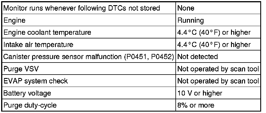 While the engine is running and the purge VSV is ON (open), the ECM monitors the purge flow by measuring the EVAP pressure change. If negative pressure is not created, the ECM begins the 2nd monitor.