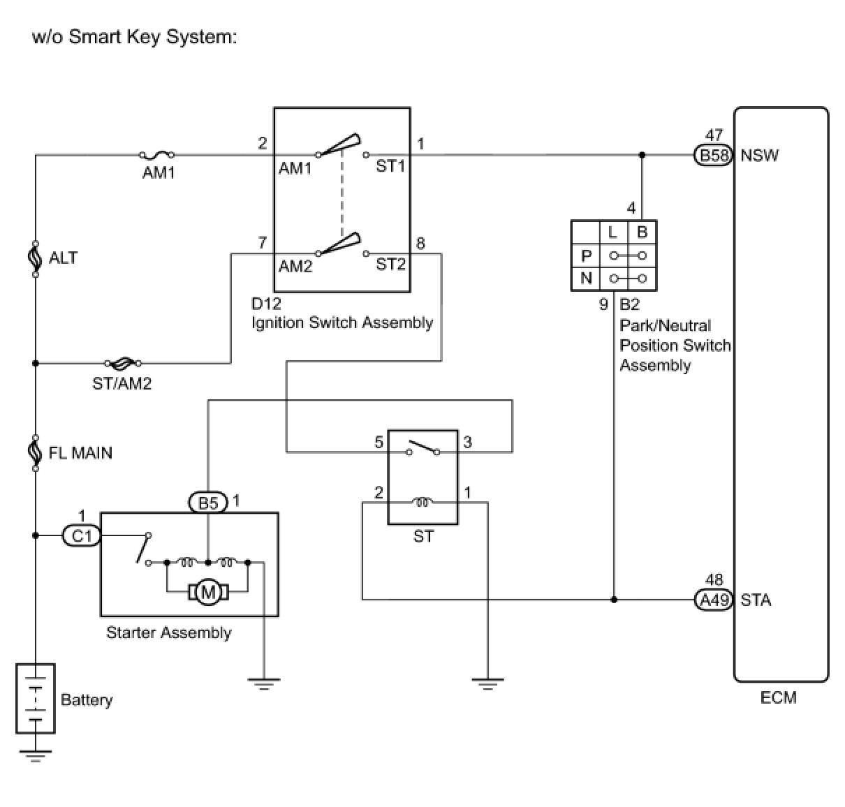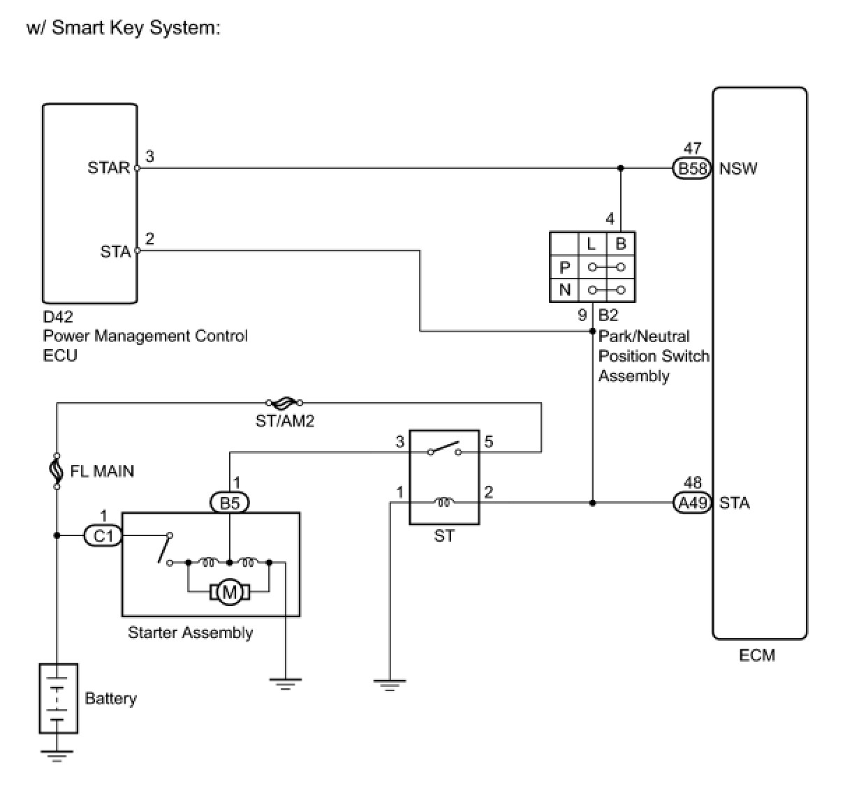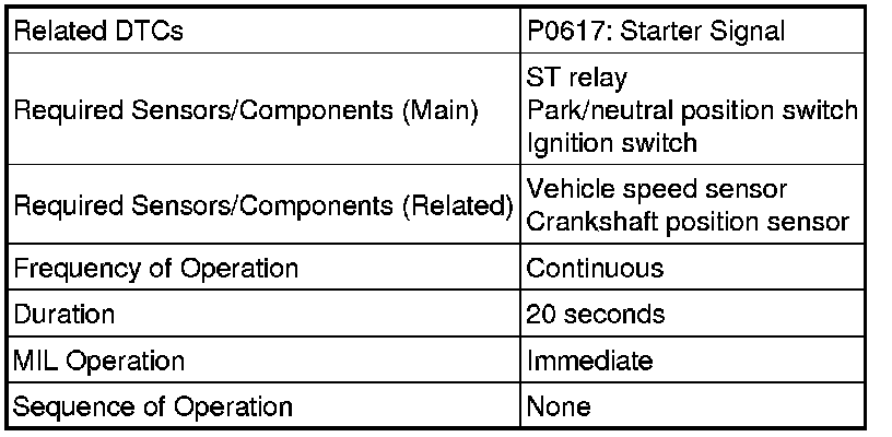 While the engine is being cranked, battery voltage is applied to terminal STA of the ECM. If the ECM detects the Starter Control (STA) signal while the vehicle is being driven, it determines that there is a malfunction in the STA circuit. The ECM then illuminates the MIL and stores the DTC.
