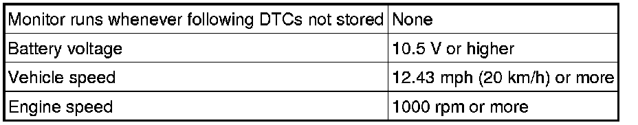 This monitor runs when the vehicle is driven at 12.43 mph (20 km/h) or more for over 20 seconds.