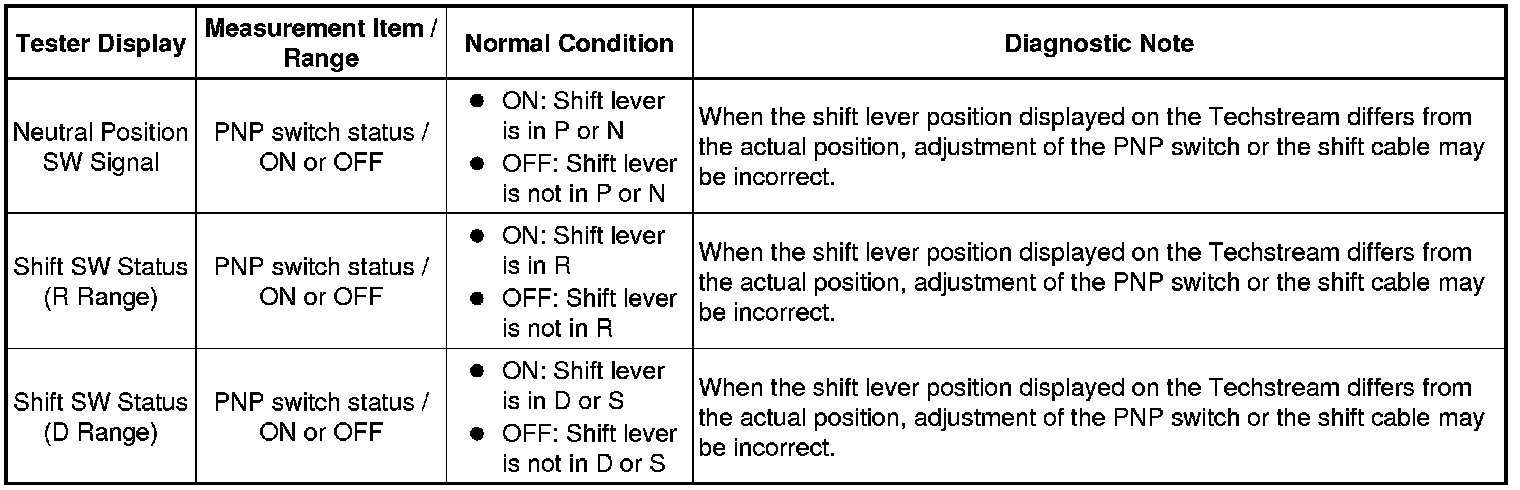 Using the Techstream to read the Data List allows the values or states of switches, sensors, actuators and other items to be read without removing any parts. This non-intrusive inspection can be very useful because intermittent conditions or signals may be discovered before parts or wiring is disturbed. Reading the Data List information early in troubleshooting is one way to save diagnostic time.
