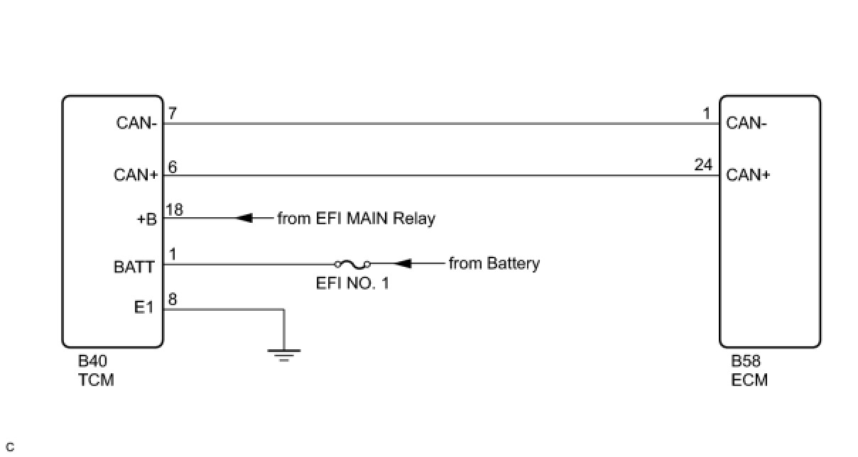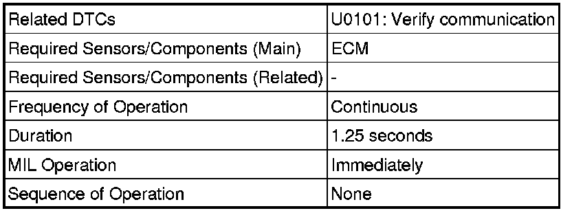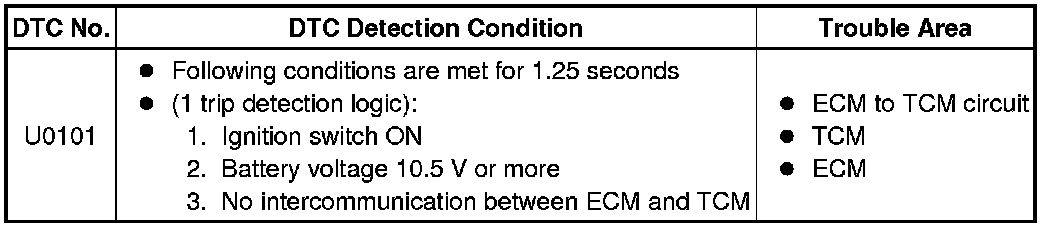 The Transmission Control Module (TCM) and ECM perform 2-way communication with each other via the Controller Area Network (CAN). The TCM sends signals to the ECM concerning required engine speed, required engine torque, warning indicators in the combination meter, DTCs and other data. The ECM sends signals to the TCM concerning engine speed, opening angle of the throttle valve, temperature of intake air, temperature of engine coolant, engine torque and other data. If the TCM cannot communicate with the ECM, the TCM will conclude that there is a malfunction in the CAN system, illuminate the MIL and set a DTC.