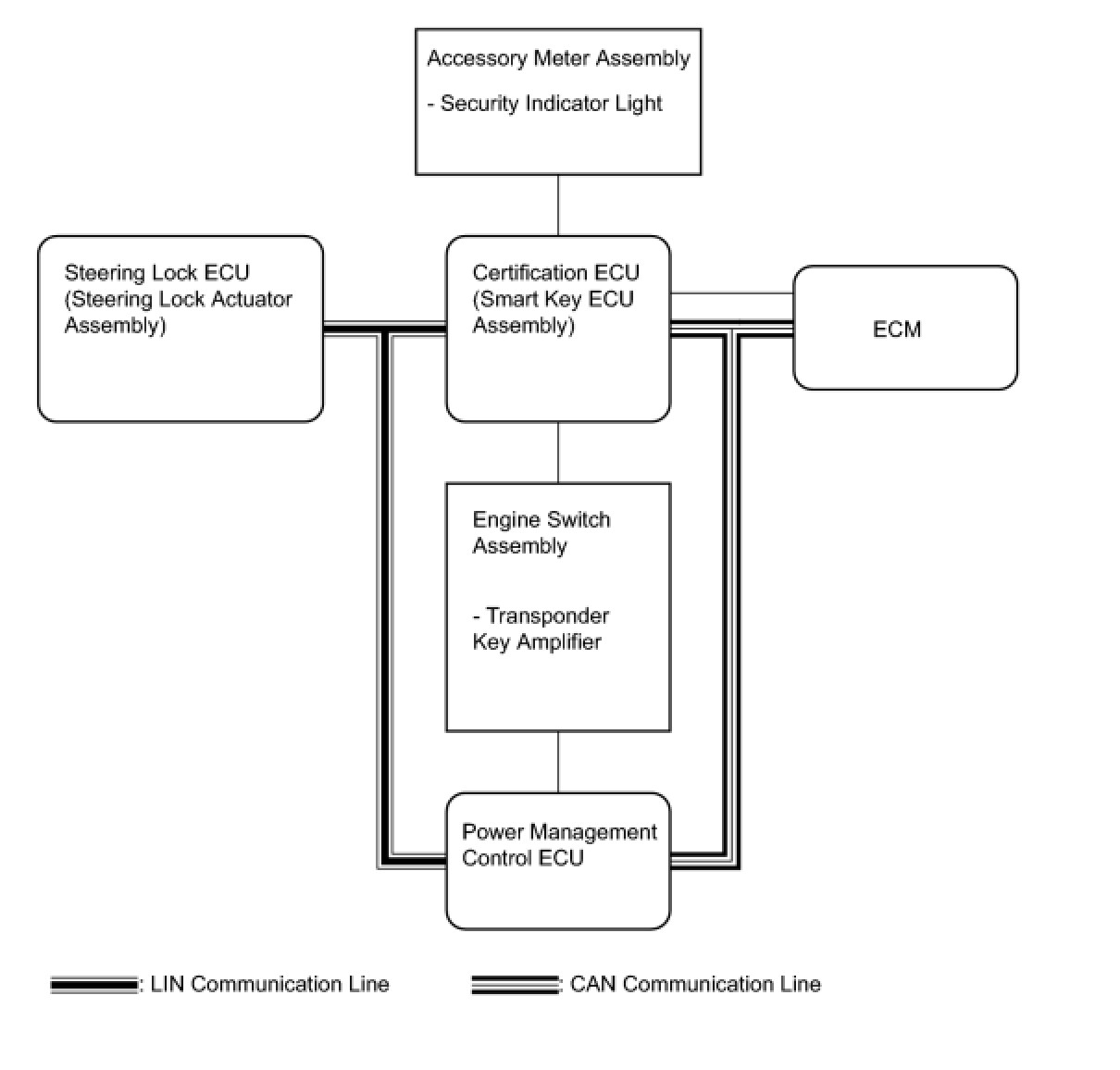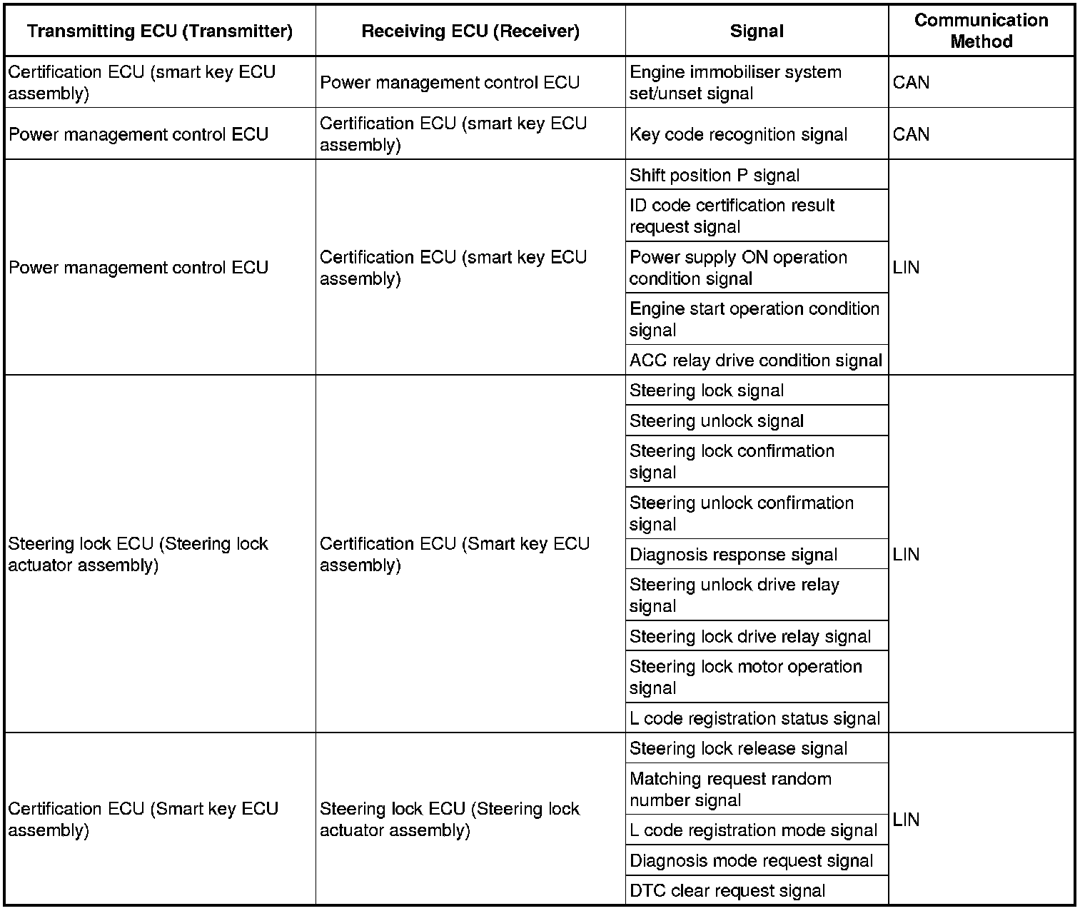 The immobiliser system is a theft deterrent system that determines whether to disable starting of the SFI system based on a comparison of the key ID code and the vehicle pre-registered code. The immobiliser system compares the vehicle certification ECU (smart key ECU assembly) pre-registered ID code with the ID of the key-embedded transponder chip. If the ID codes do not match, the immobiliser system is activated and the SFI system cannot be started. The certification ECU (smart key ECU assembly) manages communication with the ECM, power management control ECU and steering lock ECU (steering lock actuator assembly). When the ID codes of the transponder chip and certification ECU (smart key ECU assembly) match, the certification ECU (smart key ECU assembly) authorizes the SFI system to start.