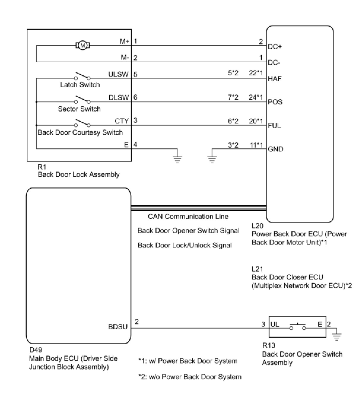 When the back door cannot be opened, one of the following may be malfunctioning: 1) power back door ECU (power back door motor unit)*1 or back door closer ECU (multiplex network door ECU)*2, 2) back door lock assembly, 3) back door opener switch assembly, or 4) main body ECU (driver side junction block assembly).