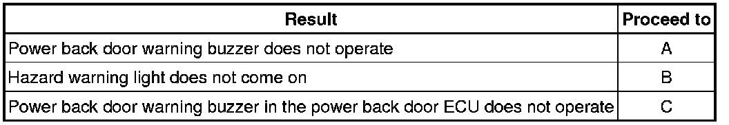 When the power back door warning system does not operate, one of the following may be malfunctioning: 1) power back door warning buzzer circuit, 2) wireless door lock control system or 3) power back door ECU.