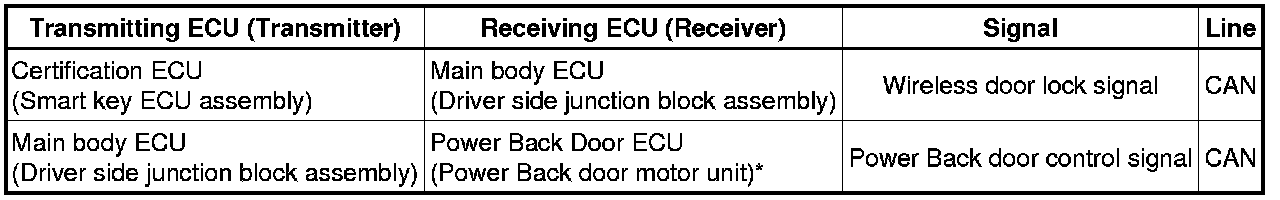 The door control transmitter has the LOCK, UNLOCK, POWER BACK DOOR* and PANIC switches. Operating these switches activates each function.