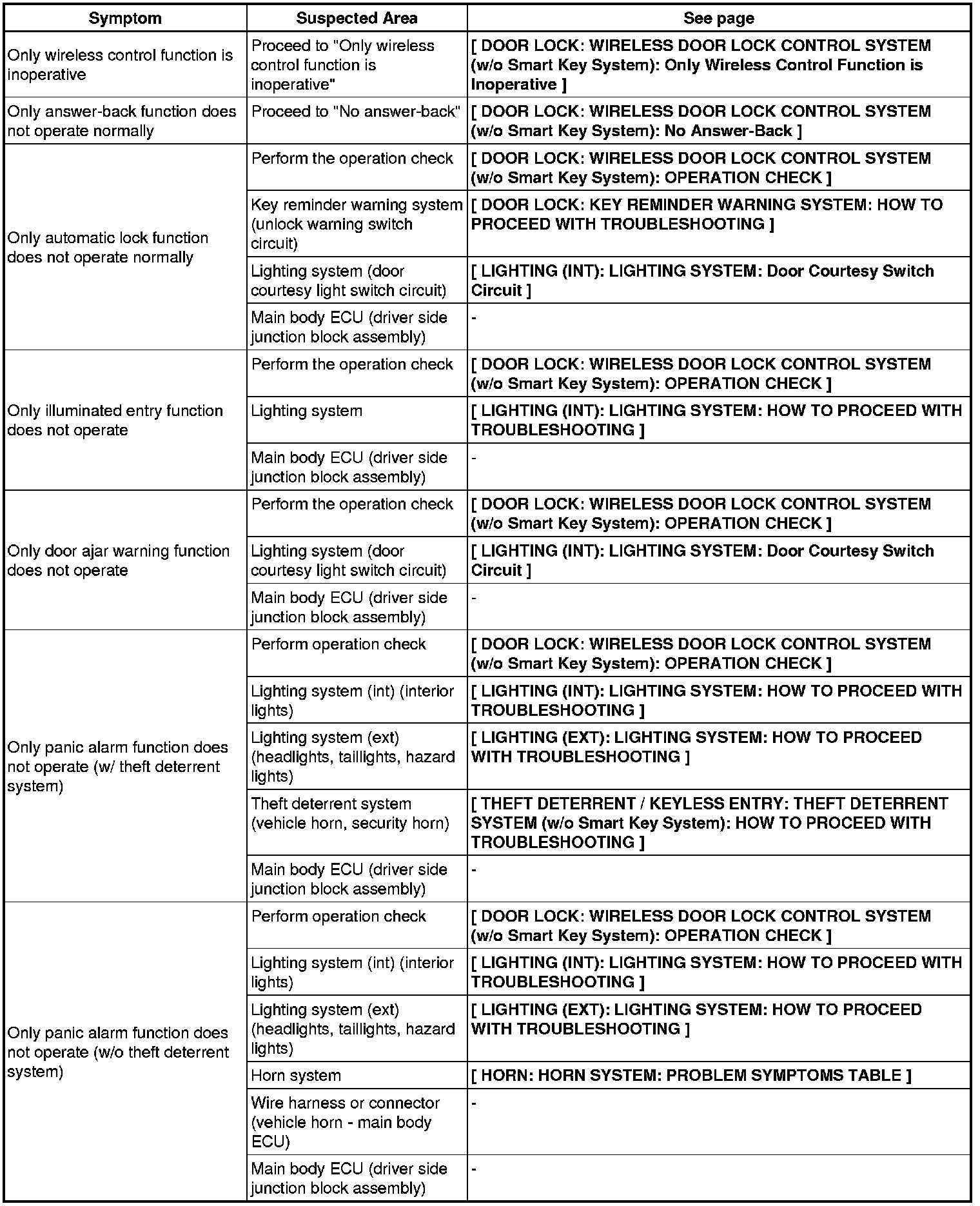 DOOR LOCK: WIRELESS DOOR LOCK CONTROL SYSTEM (w/o Smart Key System): PROBLEM SYMPTOMS TABLE