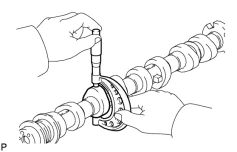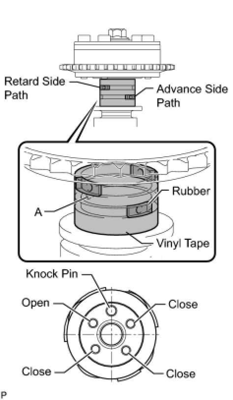 (6) When the camshaft timing exhaust gear moves to the most retarded position, release the air pressure from the advance side path, and then release the air pressure from the retard side path.