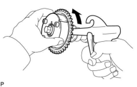 (4) While applying approximately 200 kPa (2.0 kgf/ cm2, 29 psi) of air pressure to the oil path, forcibly turn the camshaft timing gear assembly in the advance direction (counterclockwise).