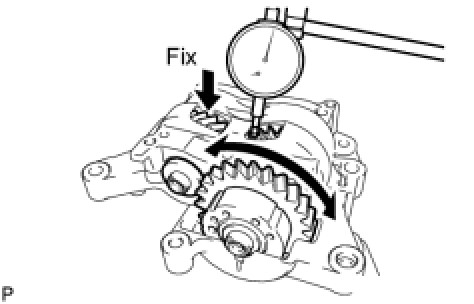 (a) Secure the No. 2 balance shaft in place, and then using a dial indicator, measure the backlash of the No. 1 and No. 2 balance shafts as shown in the illustration.