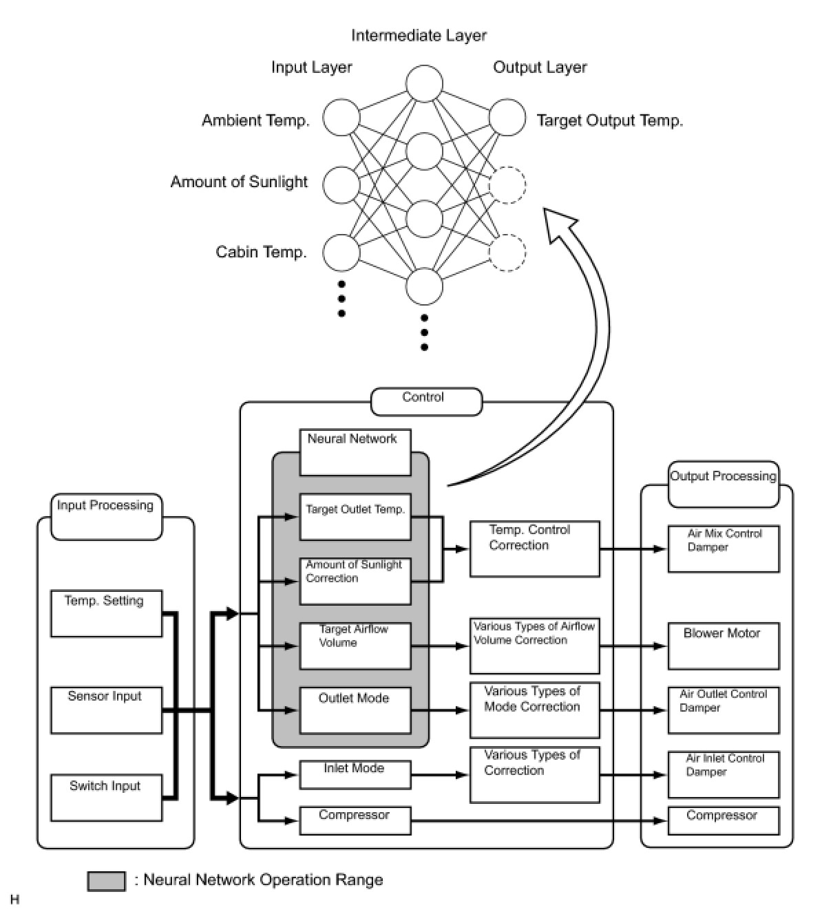 * The neural network control consists of neurons in the input layer, intermediate layer and output layer. The input layer neurons process the input data of the outside temperature, the amount of sunlight and the room temperature based on the outputs of the switches and sensors, and output them to the intermediate layer neurons. Based on this data, the intermediate layer neurons adjust the strength of the links among the neurons. The sum of these is then calculated by the output layer neurons in the form of the required outlet temperature, solar correction, target airflow volume and outlet mode control volume. Accordingly, the A/C amplifier controls the servo motors and blower motor in accordance with the control volumes that have been calculated by the neural network control.