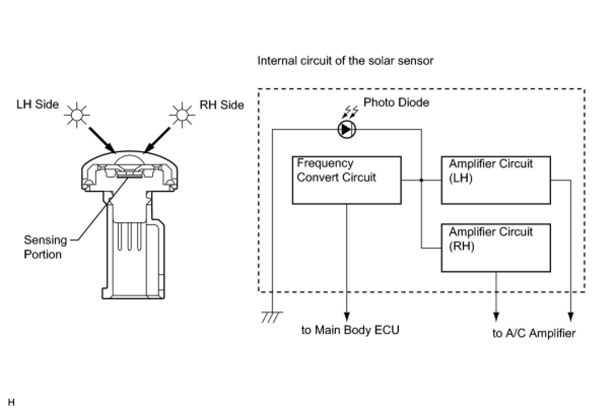 (b) The solar sensor detects (in the form of changes in the current that flows through the built-in photo diode) the changes in the amount of sunlight from the LH and RH sides (2 directions) and outputs these sunlight strength signals to the A/C amplifier.