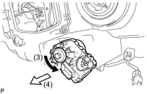 (d) Pull out the headlight leveling motor in the direction indicated by the arrow (4) shown in the illustration to remove it.
