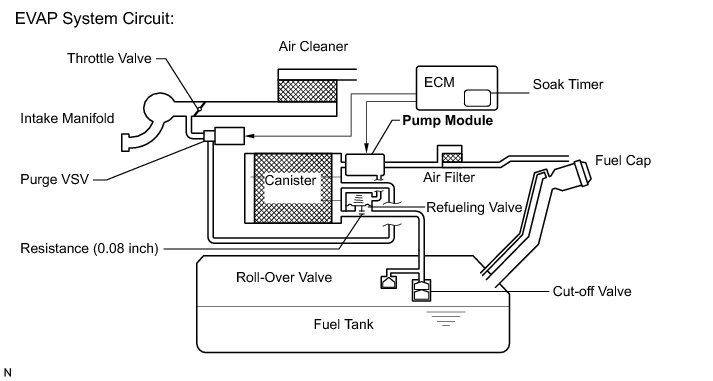The leak detection pump creates negative pressure (vacuum) in the EVAP system and the pressure is measured. Finally, the ECM monitors for leaks from the EVAP system, and malfunctions in both the canister pump module and purge VSV based on the EVAP pressure.