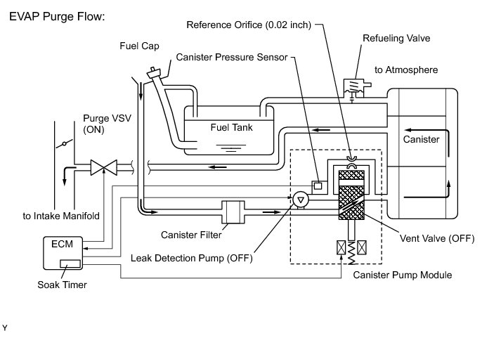 While the engine is running and the purge VSV is on (open), the ECM monitors the purge flow by measuring the EVAP pressure change. If negative pressure is not created, the ECM begins the 2nd monitor.