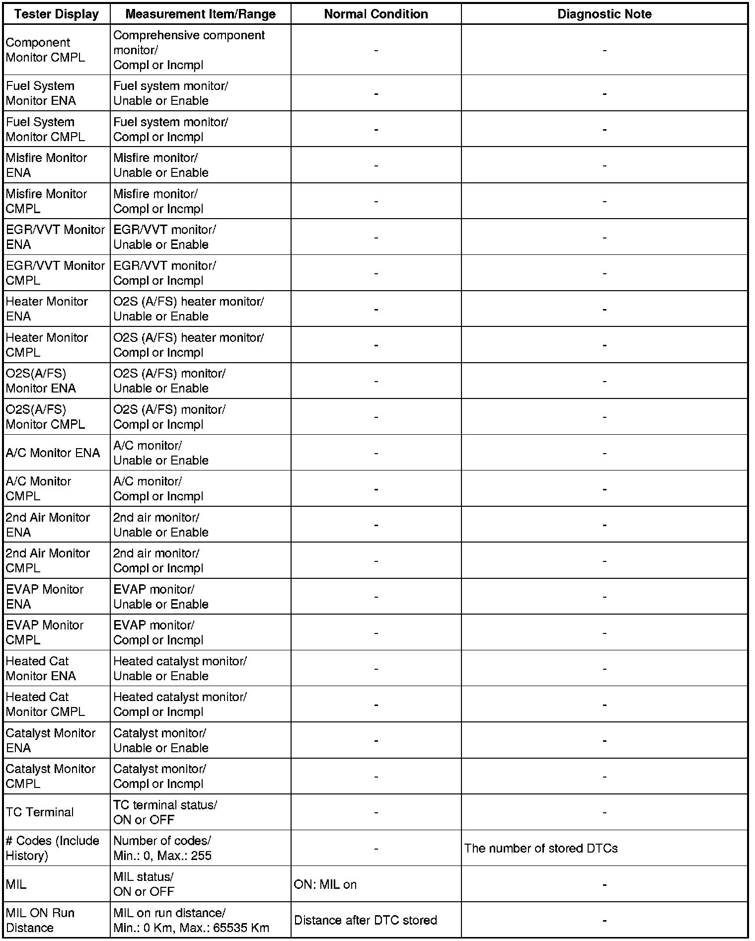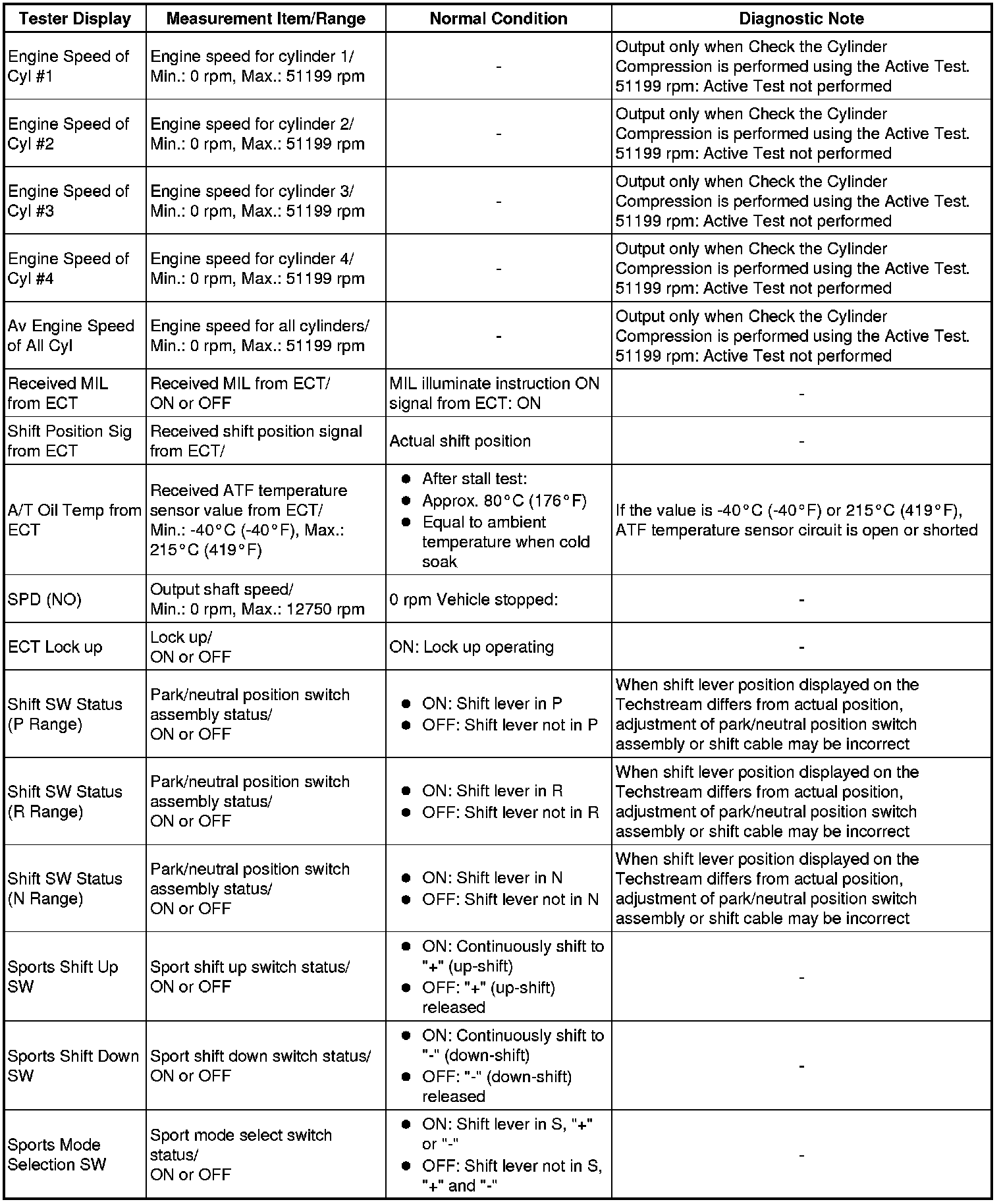 Using the Techstream to read the Data List allows the values or states of switches, sensors, actuators and other items to be read without removing any parts. This non-intrusive inspection can be very useful because intermittent conditions or signals may be discovered before parts or wiring is disturbed. Reading the Data List information early in troubleshooting is one way to save diagnostic time.