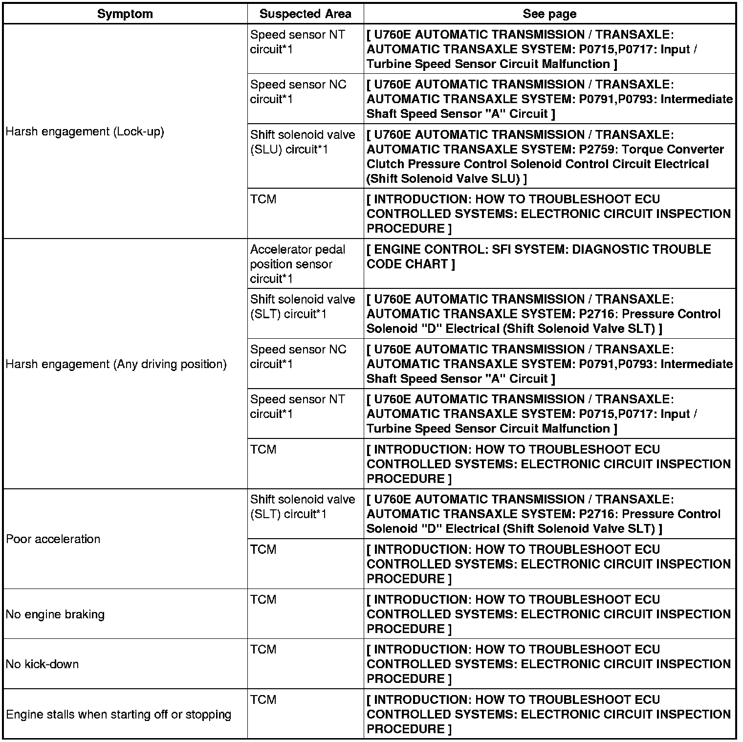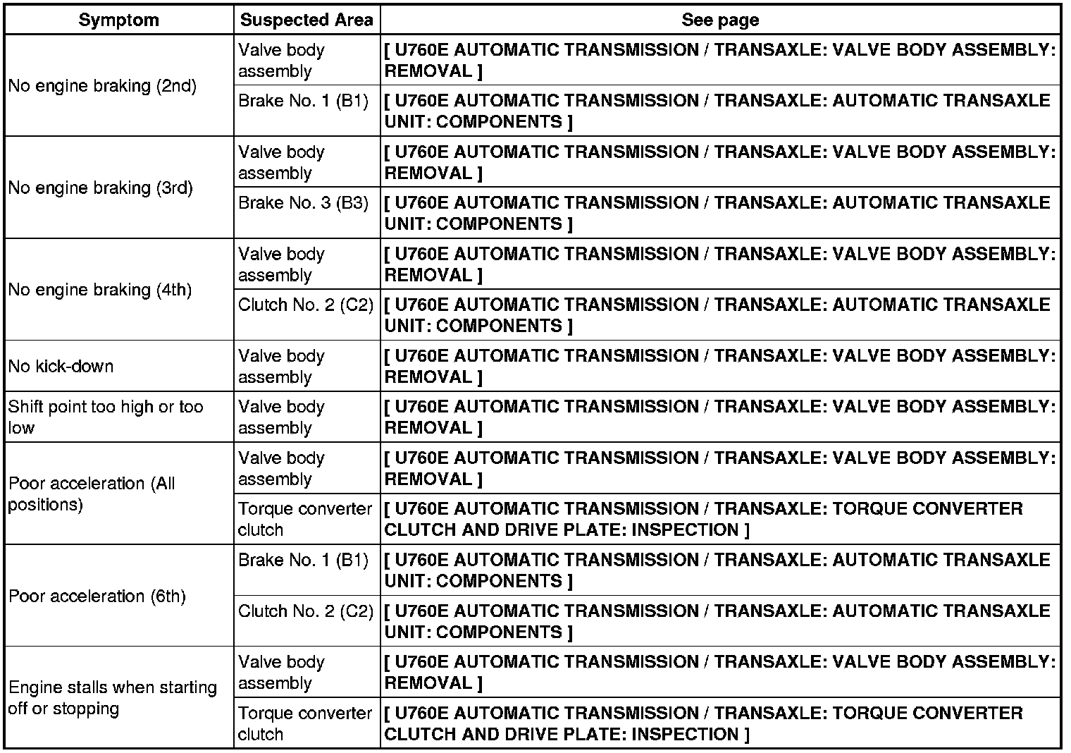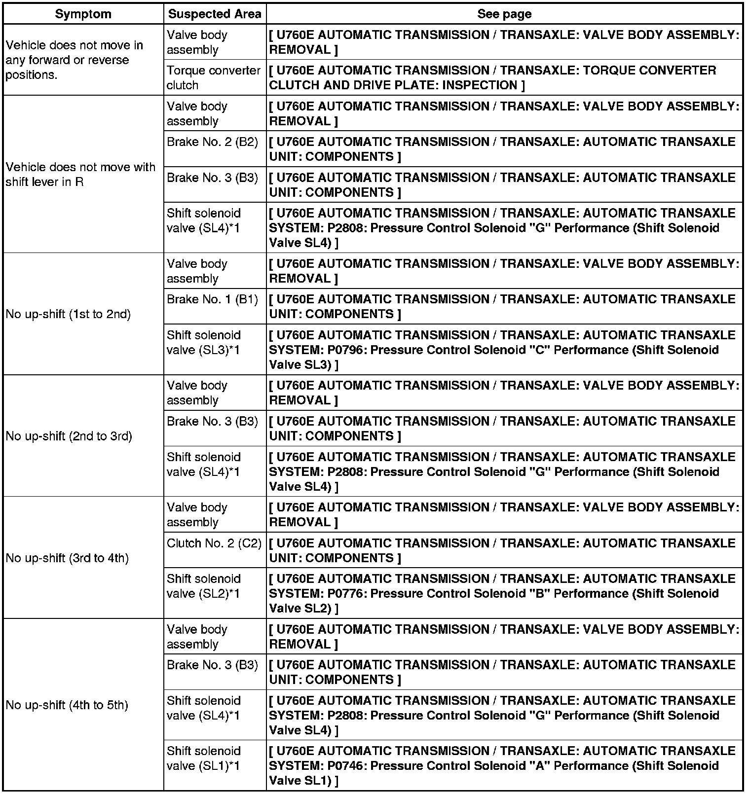 U760E AUTOMATIC TRANSMISSION / TRANSAXLE: AUTOMATIC TRANSAXLE SYSTEM: PROBLEM SYMPTOMS TABLE