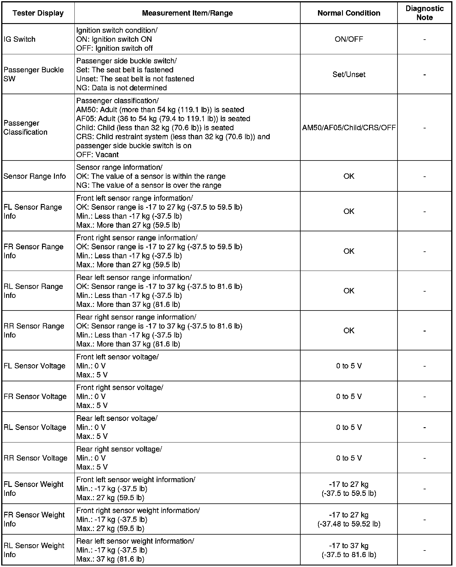 SUPPLEMENTAL RESTRAINT SYSTEMS: OCCUPANT CLASSIFICATION SYSTEM: DATA LIST / ACTIVE TEST