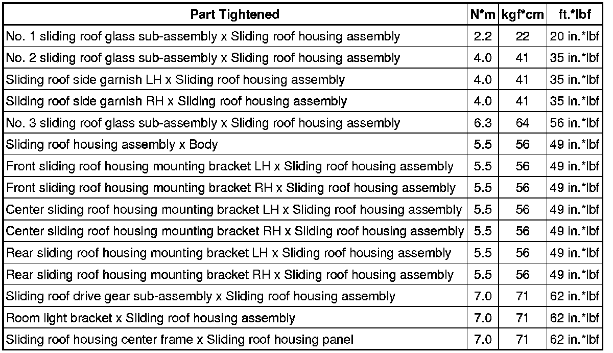 SPECIFICATIONS: SLIDING ROOF / CONVERTIBLE: TORQUE SPECIFICATIONS