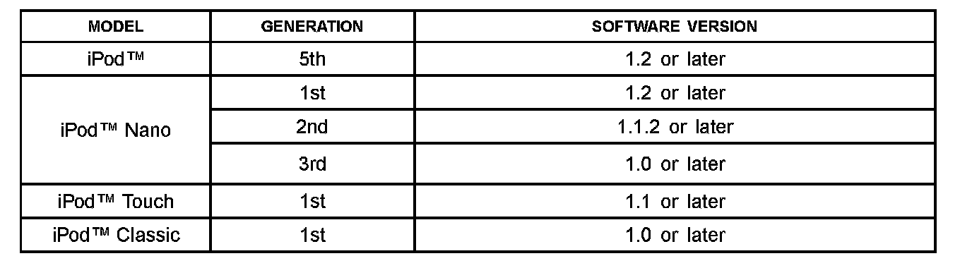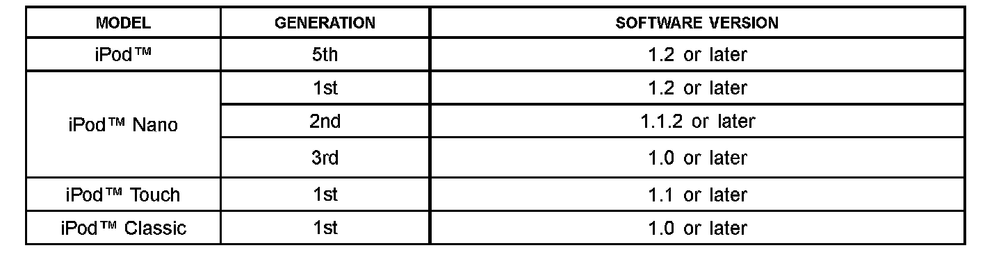 1. Please compare customer's iPod(TM) with the compatible models table listed below. If the customers' iPod(TM) is NOT listed, this TSB does NOT apply.