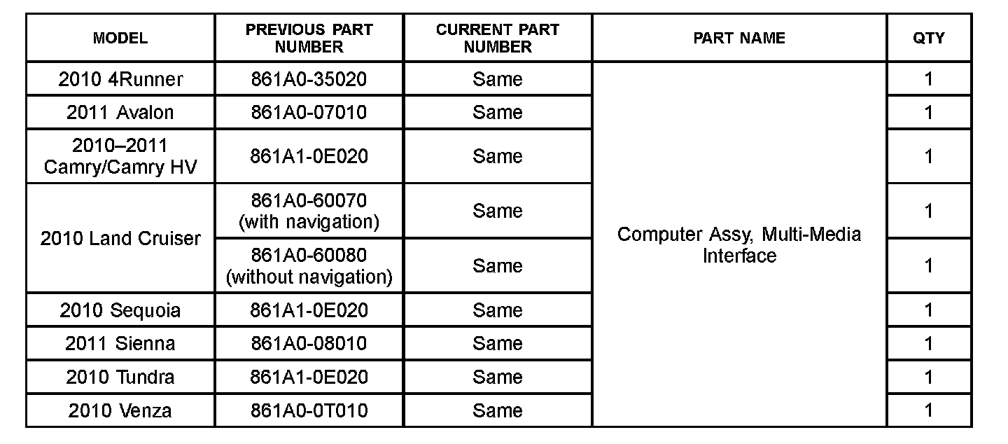 Some 2010 - 2011 Toyota vehicles may exhibit intermittent operation of USB/iPod(TM) devices while in use. A newly designed Multi-Media Interface ECU has been developed to correct this condition.