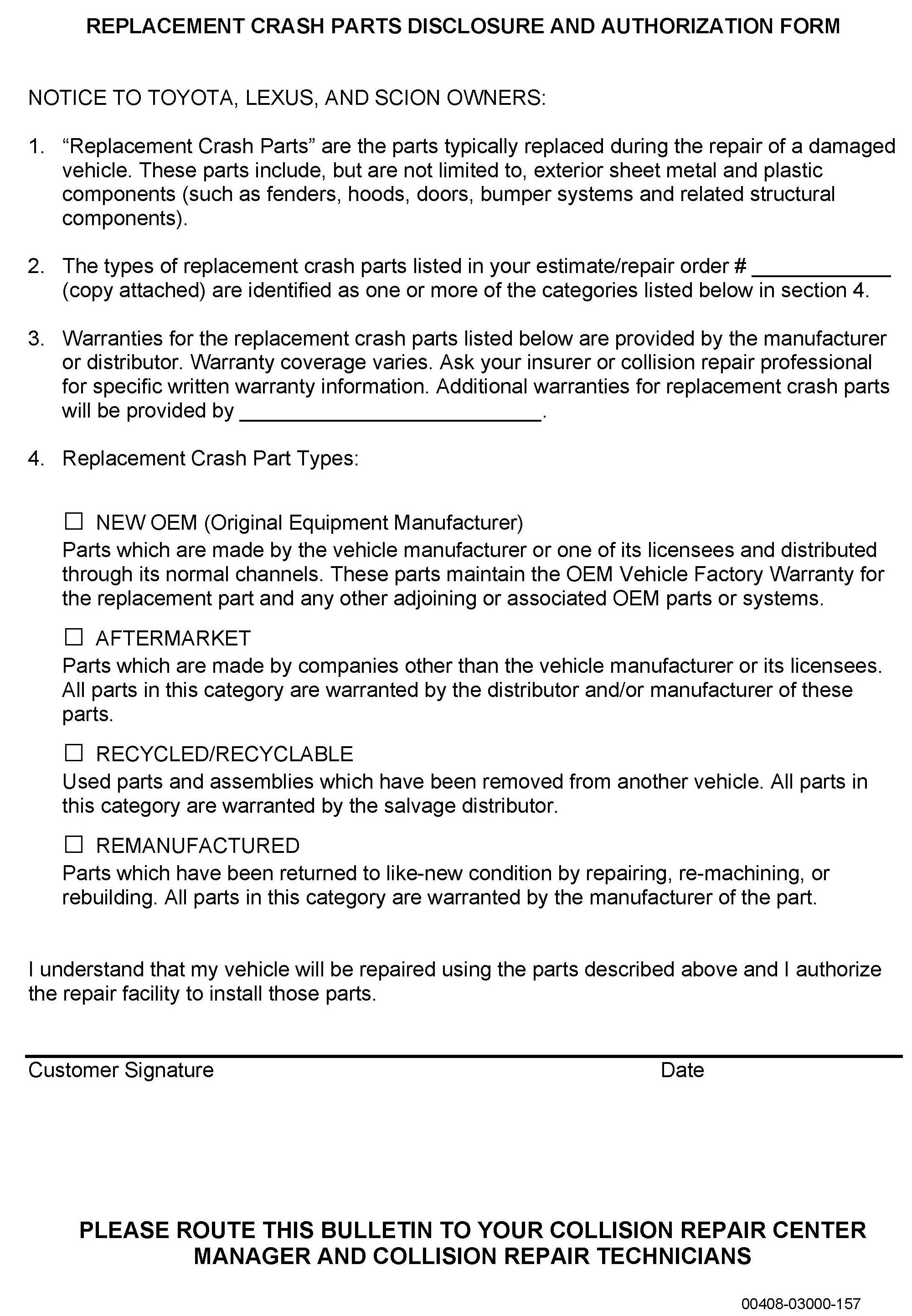 REPLACEMENT CRASH PARTS DISCLOSURE AND AUTHORIZATION FORM