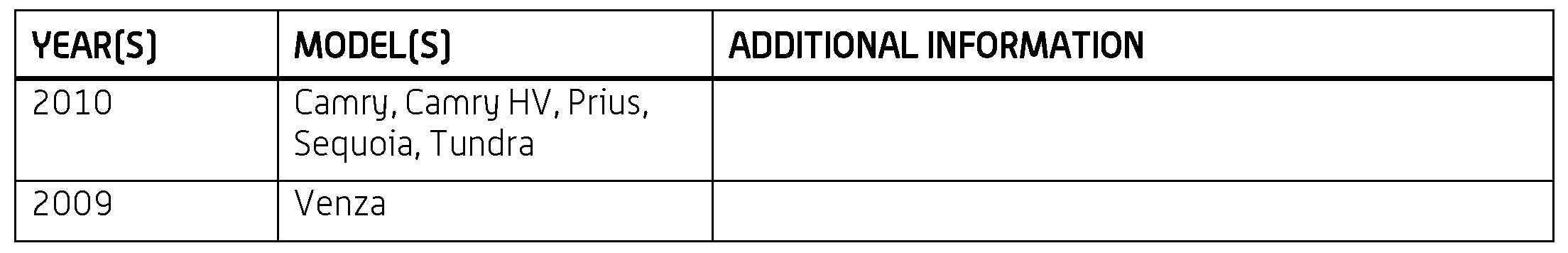'10 Camry; Camry HV; Prius; Sequoia; Tundra; '09 Venza