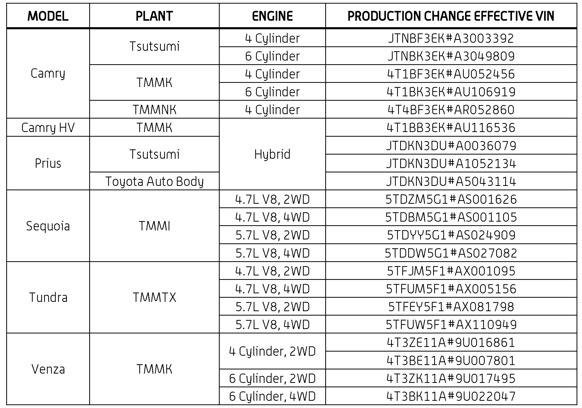 This TSB applies to vehicles with the Toyota Navigation System produced BEFORE the Production Change Effective VINs shown.