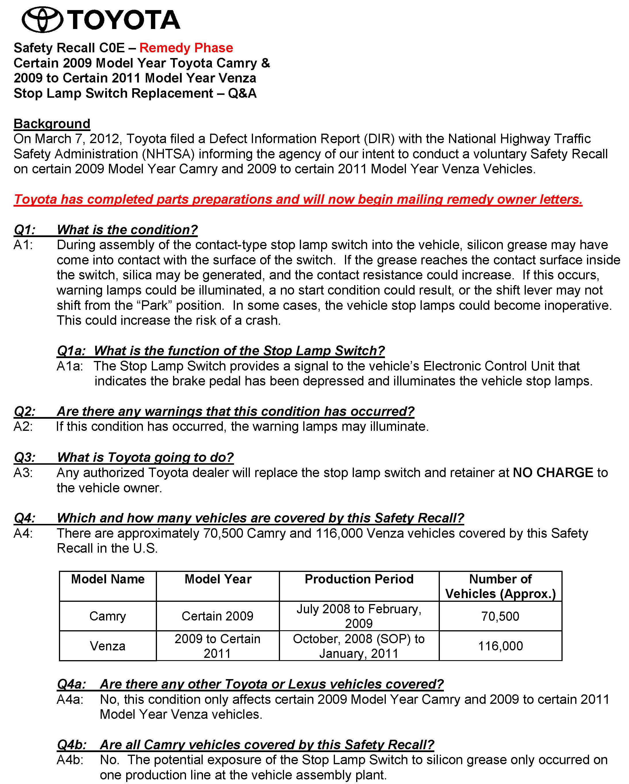 Recall - Brake Light Switch Replacement