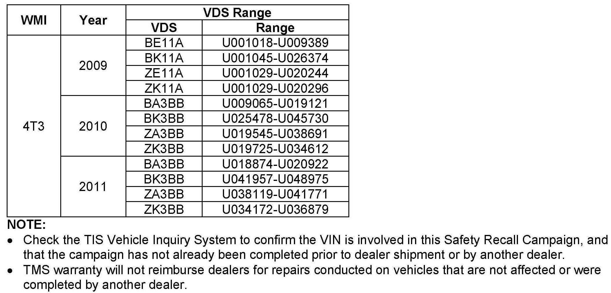 CERTAIN 2009 MODEL YEAR CAMRY
