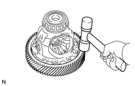 (c) Using a plastic hammer, tap on the front differential ring gear to remove it from the case.