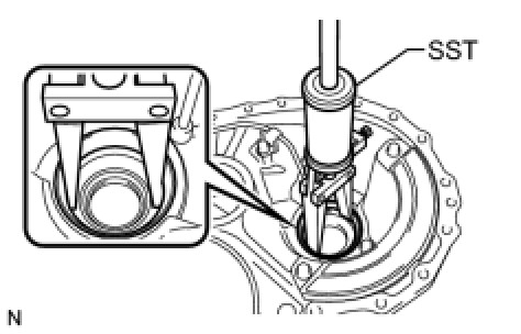(b) Using SST, remove the front differential case rear tapered roller bearing outer race from the transaxle case.