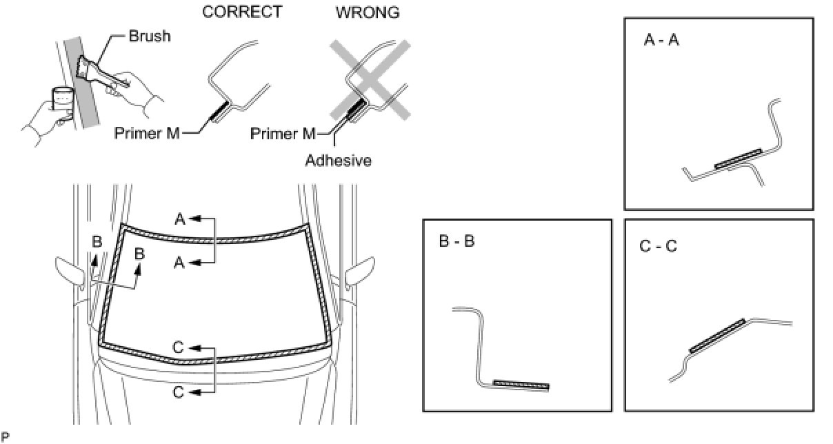 (a) Using a brush or a sponge, coat the application area of the windshield glass adhesive dam with Primer G.