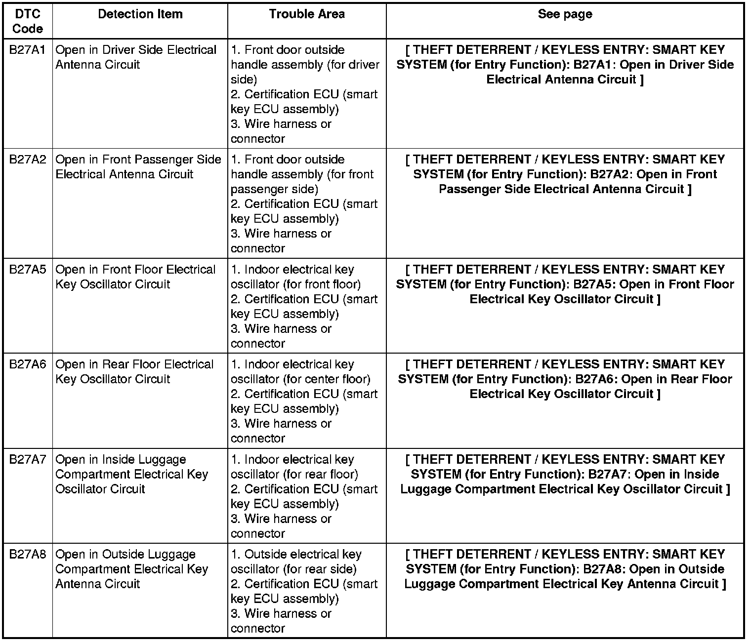 THEFT DETERRENT / KEYLESS ENTRY: SMART KEY SYSTEM (for Entry Function): DIAGNOSTIC TROUBLE CODE CHART