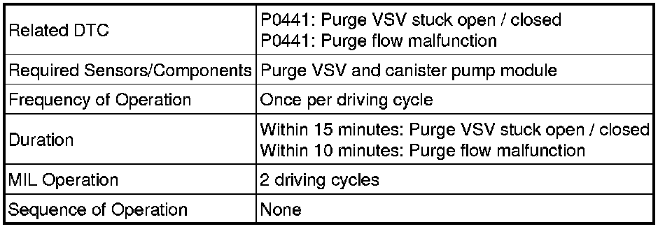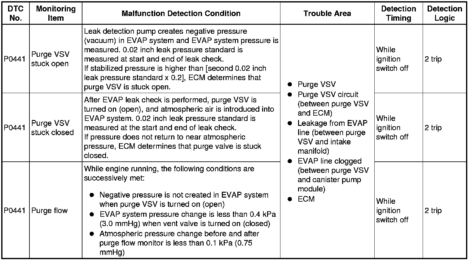 The vent valve is turned on (closed) and the EVAP pressure is then measured. If the variation in the pressure is less than 0.4 kPa (3.0 mmHg), the ECM interprets this as the purge VSV being stuck closed, and illuminates the MIL and sets DTC P0441 (2 trip detection logic).